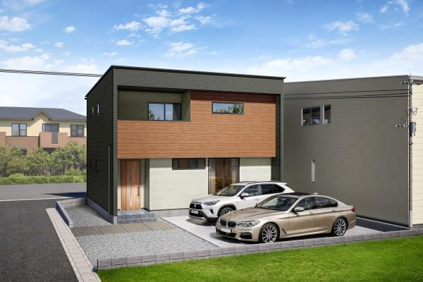 【外観】シンプルで洗練されたデザインの外観が特徴的です。ゆとりある駐車スペースが確保され利便性も感じられます。グリーンに囲まれたエントランスで温かみを演出しています。