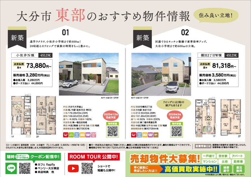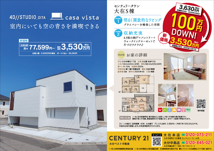 センチュリータウン大在S棟 100万円プライスダウン チラシ 2025.10.26 #値下げ #プライスダウン #100万円プライスダウン #100万円値下げ #100万円 #大在 #センチュリータウン #4D//STUDIO.OITA #新価格 センチュリータウン大在S棟100万円プライスダウン4D//STUDIO.OITA casa vistaの大在にあるお家が100万円プライスダウンになりました。室内にいても空の青さを満喫できるダイニング、家族が自然と集まるリビングにスタディースペースパントリーなどの収納たっぷりのお家です。特設ページ://c21oitabest.hp.peraichi.com/ozai_s? next センチュリータウン関園ⅡS棟 100万円プライスダウン 2025.10.26